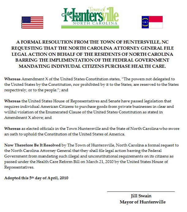 Taking the first local steps in opposition of the recent healthcare legislation, Huntersville Town Commissioner and At-Large County Commission candidate Charles Jeter will be submitting two separate binding resolutions for consideration by the Huntersville Town Board at their April 5th meeting.