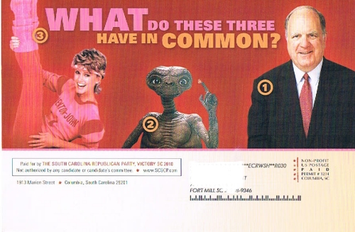 I’ve received a good number of mailers from the SC GOP Victory 2010 campaign over the past couple of weeks on behalf of Mick Mulvaney for Congress. The Party is playing its traditional role of dishing out the dirt on Mulvaney’s opposition, allowing the candidate to remain free and clear from the evils of the “politics of personal destruction”.
