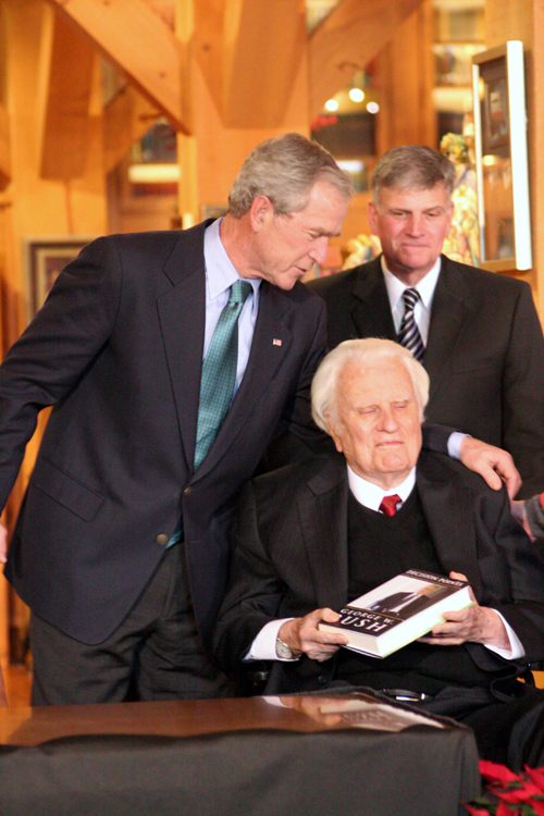 In a rare public appearance, the Rev. Billy Graham took the stage and shared some reflections with the former president, who presented the 92-year-old evangelist with a copy of his book, “Decision Points.”