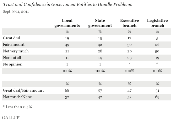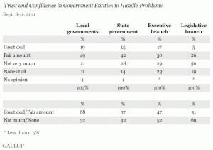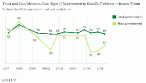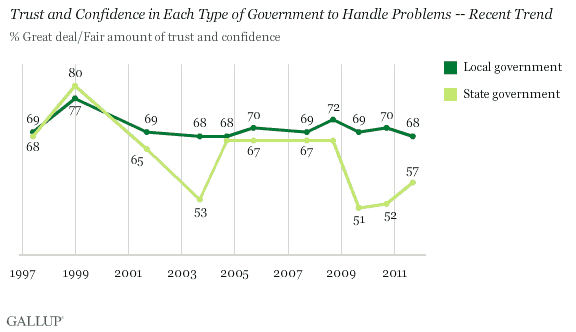 At least according to Gallup, which found in a recent poll that “two-thirds of Americans have a great deal or fair amount of confidence in their local governments to handle local problems, and a solid majority the same way about their state government.”