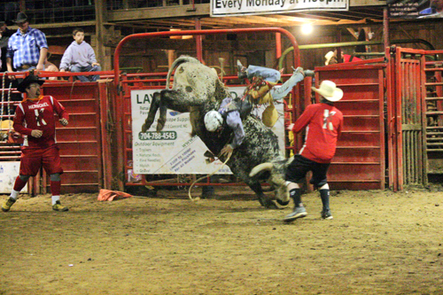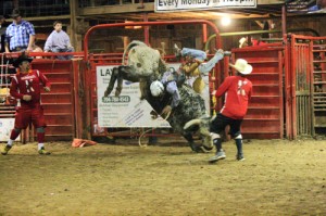 Riders hold tight during bull riding competition at the Circle K Rodeo.