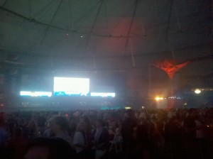 After the Paul rally in Tampa, we high-tailed it back to St. Pete to go to the GOP Welcome Event at Tropicana Field. Security was very visible, but was remarkable quick and efficient in screening folks coming into the event. My jaw hit the floor when I walked into the domed stadium. There was carpeting covering the whole field and thousands of people were there. There must have been 15 food stations, all serving something unique. Rodney Atkins performed, as well as Cirque du Soleil. The GOP did a bang-up job making everyone feel welcome. It was a great way to start the week!