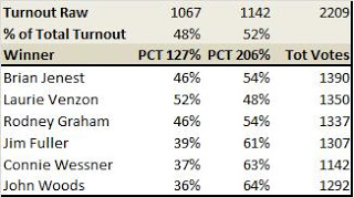 While self-sorting in Davidson won’t make a difference in this year’s State and Federal elections, its impact is already being seen in its municipal elections. Take a look at the below chart of last year’s municipal election results. You can see that half of the elected officials rely very heavily on the 206 for their votes, while the other half more or less attract half of their votes from each town precinct and more closely resemble the percentage of total turnout from each precinct. It should come as no surprise that those who rely heavily on one precinct also received the fewest total votes.