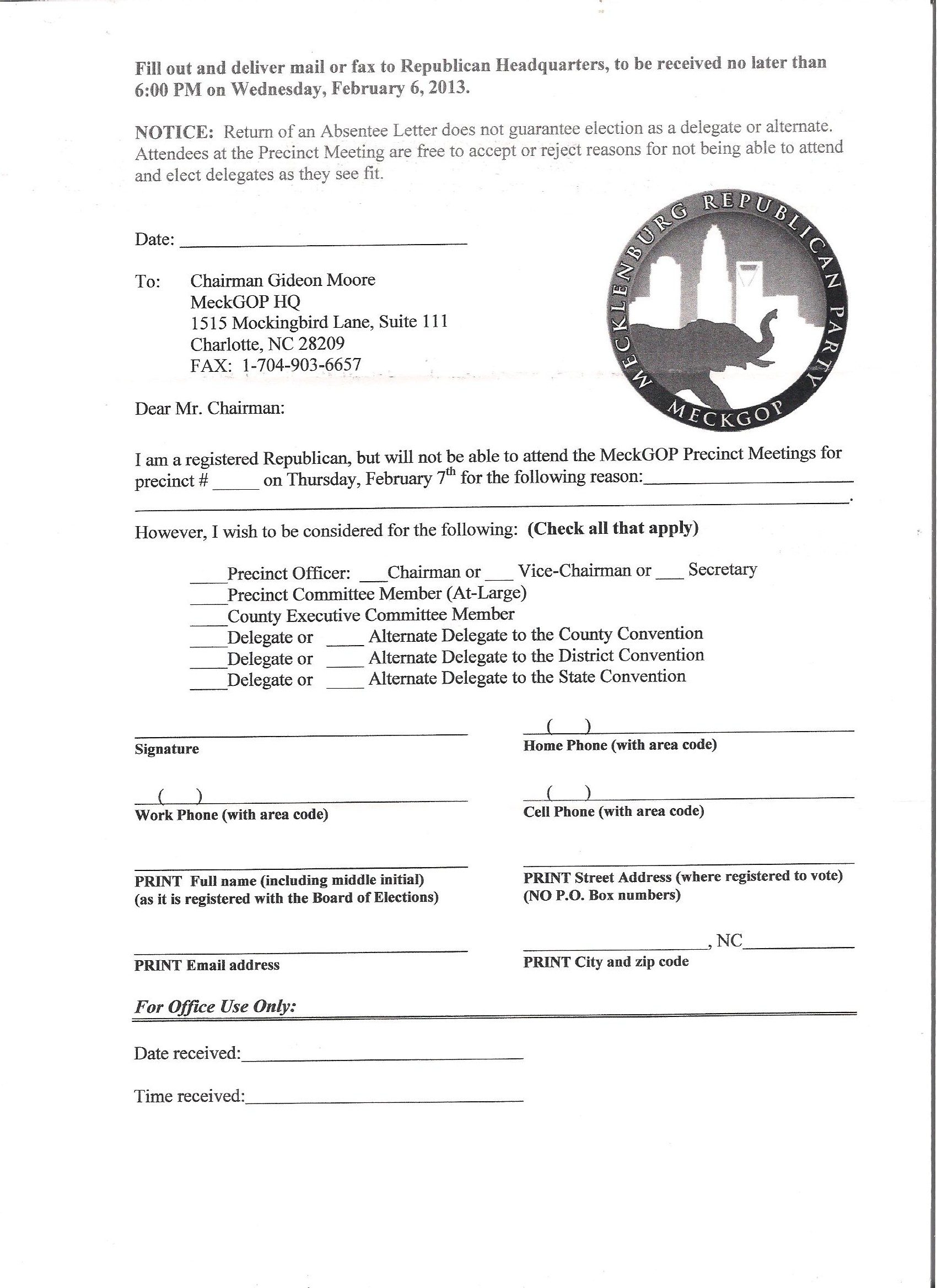 If you are unable to attend the precinct meetings, there is an absentee letter that can be submitted to the County Party. While absent from the MeckGOP website, a current precinct chairman provided PunditHouse with a scan of the form. You can download it by Clicking HERE.