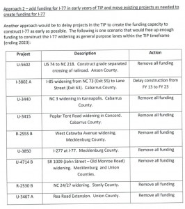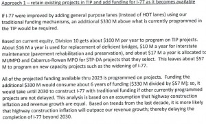What’s more telling is that a second approach was offered to construct general purpose lanes on I-77 to be completed by 2023, less than ten years from now, if other projects were put on hold or eliminated entirely.