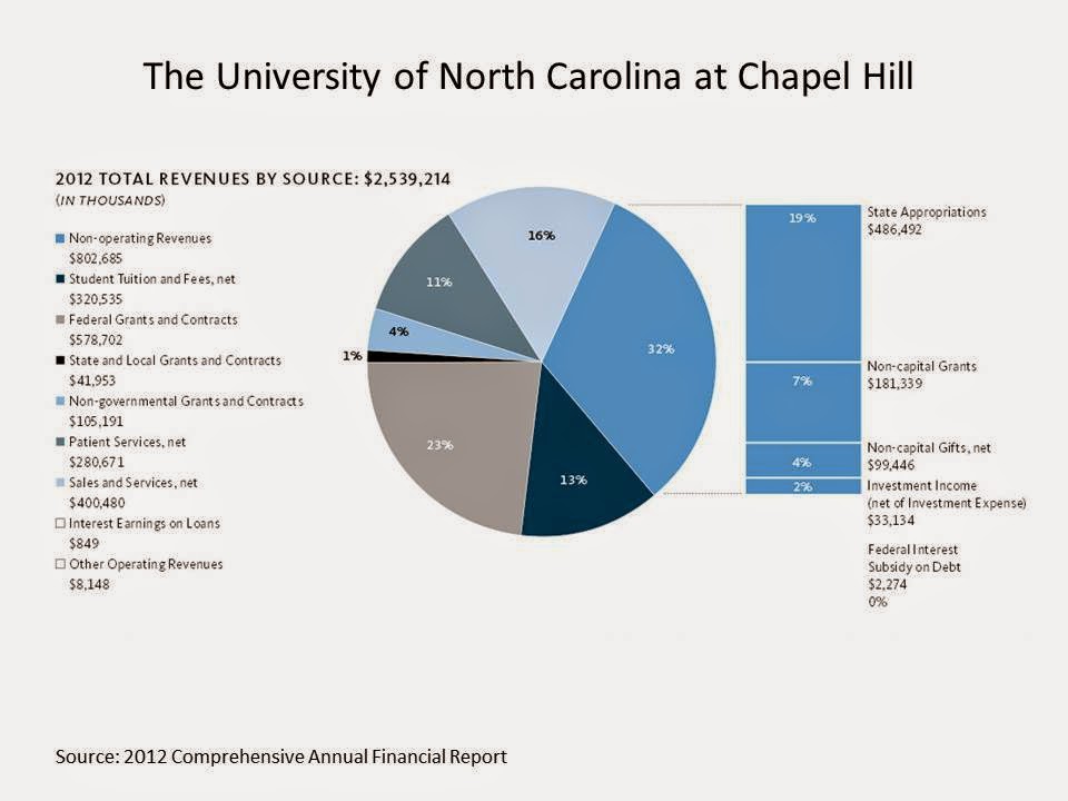 - The University of North Carolina at Chapel Hill receives about 20% of their funding from the state legislature which means the balance comes from sources including federal and state research contracts and grants, hospital-generated revenues, athletics, and private funding from endowments and annual gifts.